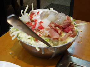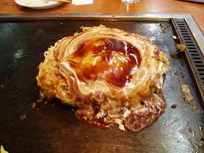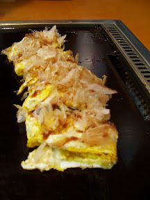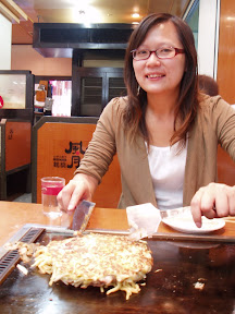 我們先回新大阪收拾房間(途中還買了551蓬萊包子,大阪好多分店,不錯吃唷),然後坐車將行李寄放到天王寺站(晚一點要從這裡搭車到機場),再坐車到難波繼續昨天未完的血拼。下午兩三點肚子餓翻了,於是就去昨天經過看到的大阪燒店「鶴橋風月」(來大阪一定要吃大阪燒的阿!!),兩個人點了一份玉子燒(很像豬肉蛋餅)跟一份風月燒加麵,玉子燒超好吃~大阪燒是店員會幫你煎(好像只有東京的月島燒才是自己來?),終於看到柴魚片跳舞的樣子,不過口味上不是很喜歡說...(peng覺得大阪燒本來就是這樣)。