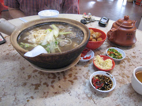 經過馬僑解釋,我才知道所謂的「肉骨茶」是指「吃肉骨湯」配「喝茶」,